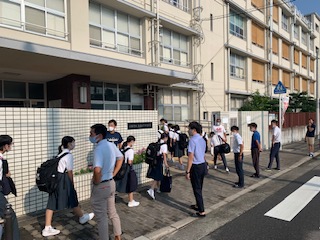 登校の様子です。まだまだ暑い日が続いていますが、元気よく挨拶をして登校しています。水分補給をこまめに行い、熱中症には気をつけましょう。