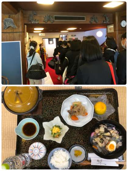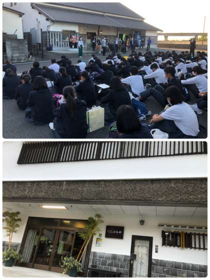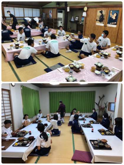 日奈久温泉に到着し、入村式を行いました。入村式の後は各宿舎に移動後、夕食です。