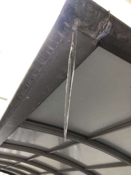 ぽたぽたと垂れる雨水が一晩で凍ってしまいました。昨夜はとても寒い夜だったんですね。