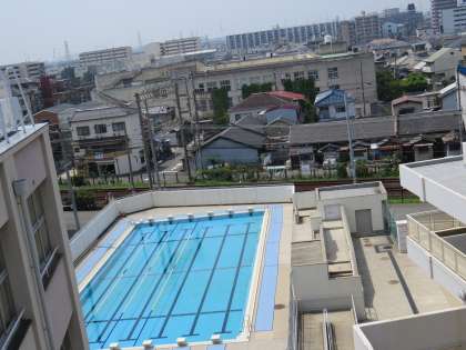 プールの奥の赤い屋根の向こうが遠里小野小学校です。