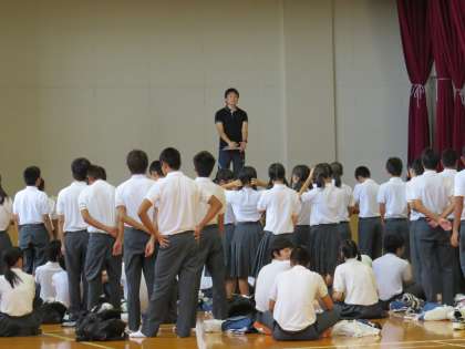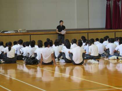 10時より体育館で学年登校日がありました。落ち着いた雰囲気で集った3年生。宿題はまだ、少し残っているようですが、あと3日あります。しっかり仕上げて来てくれるでしょう。(写真のたっている生徒は宿題がまだ、少し残っているようです)