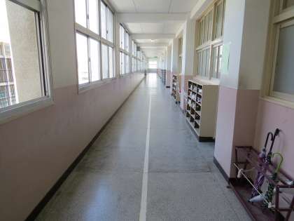 涼しい教室での授業がスタート。外は暑いですが、教室はいいです。勉強もはかどります。???廊下には生徒はいない。