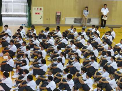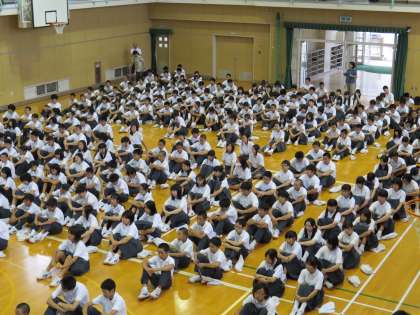 落ち着いた雰囲気 全校集会始まる     (9月2日)