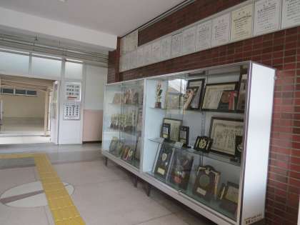 校門はいると 陳列棚 そこには 汗と涙のこもった表彰やたてが・・・・