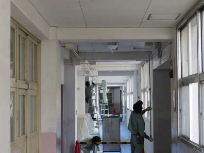 営繕班の皆さんによる作業。ありがとうございます。多目的室前廊下(3階)