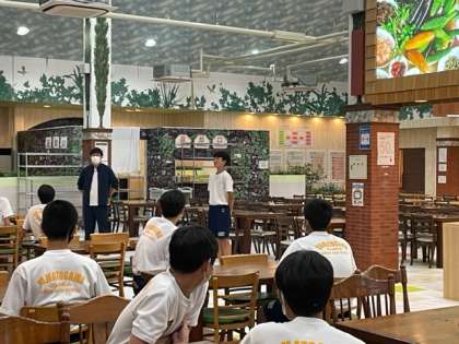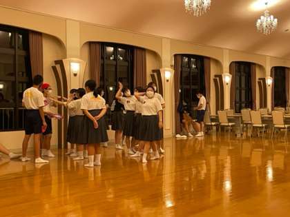 夕食を食べ終わり、明日のクラススタンツの練習を行っております。