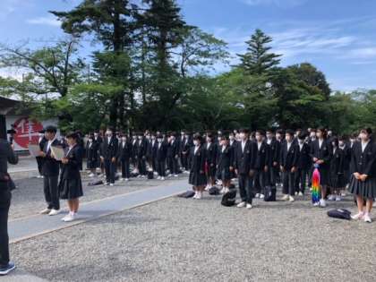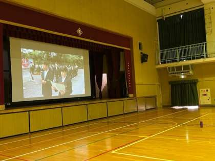 修学旅行で鹿児島県の「知覧特攻平和記念会館」に訪れている3年生と学校の体育館をライヴ中継でつなぎ、1年生、2年生も「平和セレモニー」に参加しました。