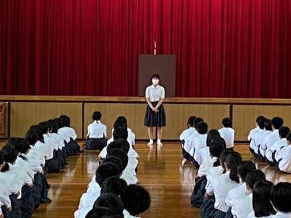 今日の全校集会では、文化委員会から「読書をしましょう」の呼びかけや生徒会から「合同給食」の振り返りがありました。