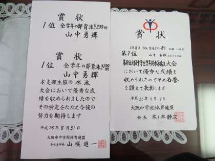 表彰 水泳  大阪中学校水泳競技大会 出場 (9月11日)