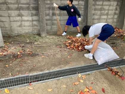 今日は朝から、生徒と先生で落ち葉の掃除をしました。