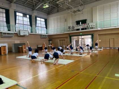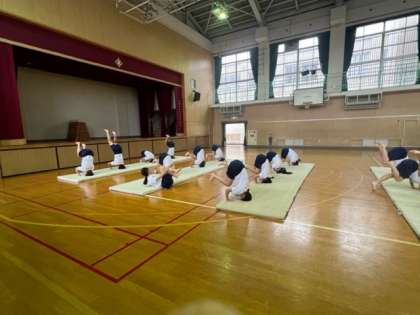 3年生の女子は体育授業で、マット運動と跳び箱運動を行っています。