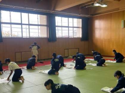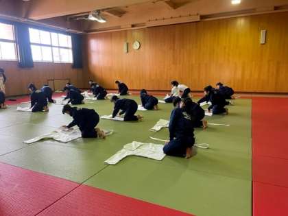 1,2年生は現在、柔道の授業を行ってます。帯を結んだり着脱の方法から座礼、立礼など柔道の大切な作法を真剣に学び、取り組むことができています。