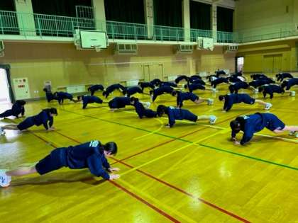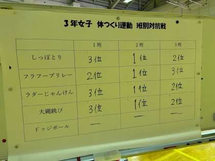 今日は、合同体育で「体つくり運動」4種目を班別に競い合いました。