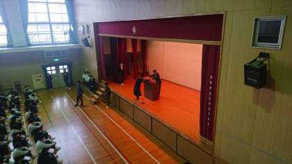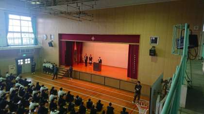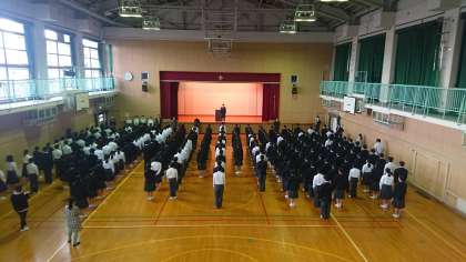 本日の全校集会では、大会で表彰された陸上部の3年生2名が全校生徒の前で話をしてくれました。