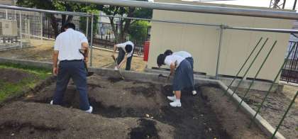 技術研究部では、夏野菜の栽培をする予定です。今日はそのための準備をしました♪畝を作り、カラスよけのネットを張ります!