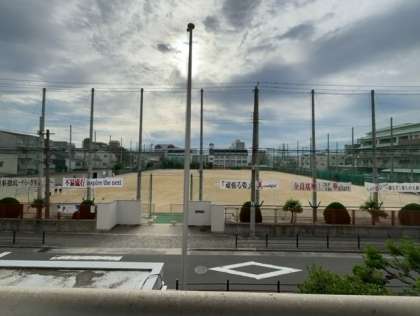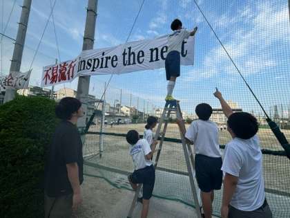 それをサッカー部の3年生が先生の指示を仰ぎながら、グラウンドのネットに取りつけてくれました。また一つ、大和川中学校の先生の指示を仰ぎながら、メンバー同士でしっかり安全確認も行っていました。