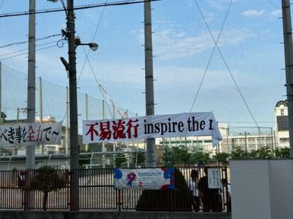 全校生徒からの思いを込めた今年のスローガンを生徒会が中心となり、横断幕を制作。