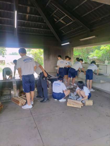 それぞれの係に分かれて準備開始です。写真は薪係の様子です。