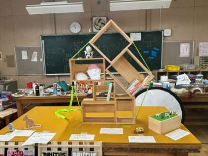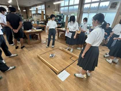 技術室で、展示されている作品を見たり、ロボットのデモストレーションを実際に体験できました。