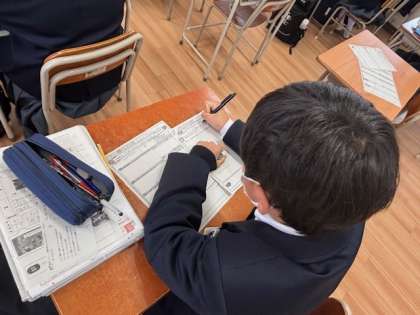 3組は、英語の授業でした。過去形を活用した文章を復習し、身につけています。