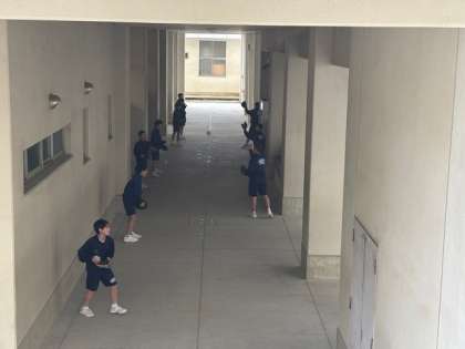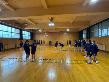 1年生と2年生の合同体育では、男子はピロティで野球、女子は格技室でトレーニング。
