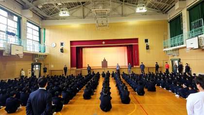月曜日は1年生が代休のため、本日火曜日に全校集会を行いました。この集会では、1年生が宿泊オリエンテーションを終えて初めて参加する重要な機会となりました。