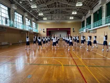 ラジオ体操の復習です。指先までしっかりと意識しています。
