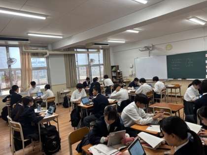 2年2組では「戦争を取材する」、3年3組では「マナーってなんだろう」を教材に自分と向き合っていました。