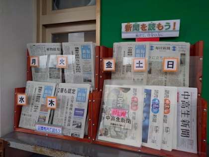 毎日の新聞を気軽に読めるようにと図書館前の靴箱上に設置してくれました。
