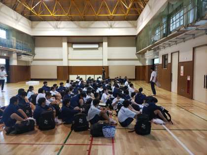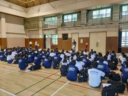 小雨だった雨が次第に強くなる中参加者全員、信太山青少年野外活動センターに到着しました。予定を変更して、入所式を行いました。これから、最初の活動のオリエンテーリングを行います。