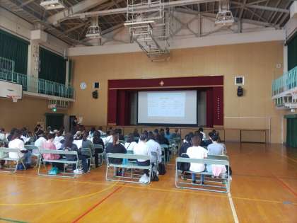 本日の放課後に進路説明会が行われました。今年最初の進路説明会です。進路担当より、昨年度の進路実績をはじめ、私立・公立の高校入試、今後のスケジュール等をパワーポイントを用い、とても丁寧に説明がありました。