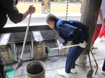 チャレンジルームの「全市合同ふれあいステイ」2日目、野外炊事でカツカレーを作りました。