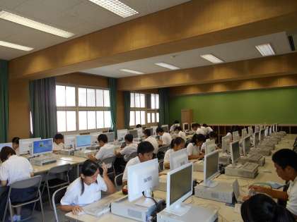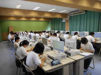 3年生の技術科の授業の様子です。「修学旅行の思い出」の作文を、デジタル作品に仕上げています。キーボードを使った入力にも慣れた様子で作業を進めています。