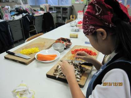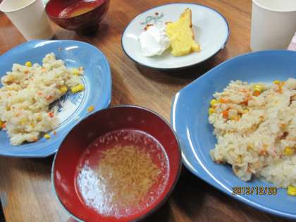 前日、みんなで買い物に行き、当日はシフォンケーキ・クッキー・シーフードピラフ・コンソメスープを作りました。