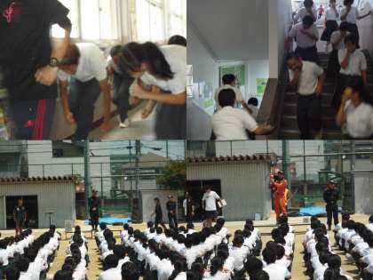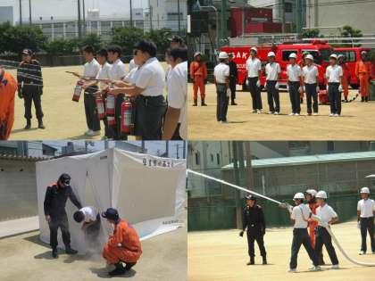 7月13日(木)に調理室からの火災を想定した避難訓練を行いました。どの学年も手を口に当てて、低い姿勢で移動するということができ、迅速に避難できていたと思います。消防署の方にも褒めていただきました。また、1年生は煙テントでの火災時の視界の悪さを体験し、2年生の代表生徒による消火器の使い方、3年生の代表生徒によるホースによる放水も行いました。
