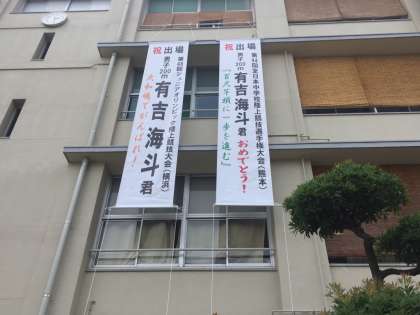 本校陸上部、有吉海斗君(男子200m)の全国大会(熊本)とジュニアオリンピック(横浜)の出場決定を祝しての垂れ幕が完成しました。