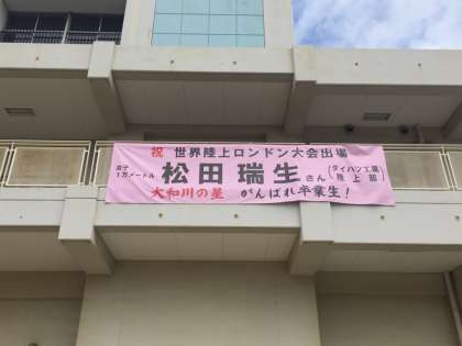 また先日報告させていただいた陸上部出身、松田瑞生選手(女子1万m)の世界陸上(ロンドン)出場を祝した垂れ幕も、体育館(線路側)に取り付けています。