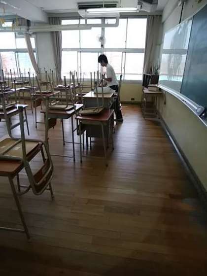 暑い中でしたが、皆のためにしっかり油をひいて教室の床をピカピカにしてくれました。