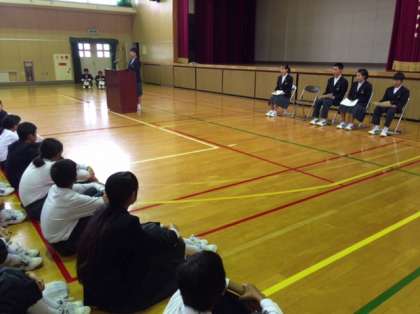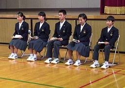 会長1名、副会長2名、執行委員2名の立候補があり、全校生徒の前で自分たちの思いを伝えました。