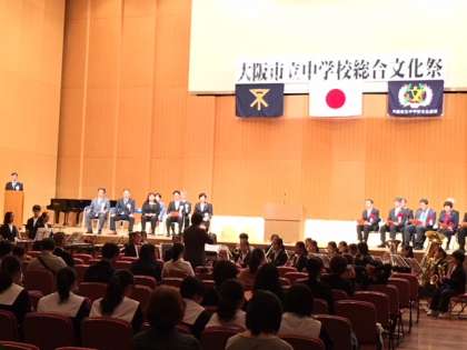 10月21日(土)に、鶴見区民センターにて、大阪市立中学校総合文化祭に出演させていただきました。開会式と舞台発表で演奏をしました。他の中学校の吹奏楽や、合唱、英語の暗唱などを見ることができ、とてもよかったし勉強になりました。これからもいろんな場所でたくさんの人に大和川の演奏を聞いていただけるように、日々の練習をがんばります!