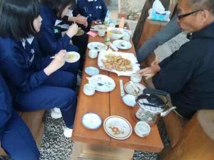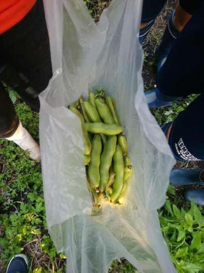 各家庭でそれぞれの体験があります。写真はお手伝いで採取した枝豆です。それから、BBQのように外で自然を堪能しながらの夕食となりました。肉巻きおにぎりです。