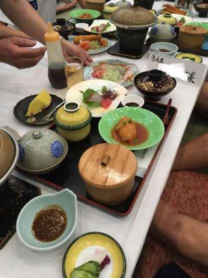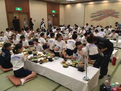 今日は指宿の海に隣接するホテルに宿泊します。夕飯は高砂殿という大広間で会食です。ご飯はおかわり自由です!