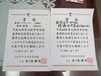 大阪市中学校体育連盟  陸上部、柔道 大会表彰 (6月10日)