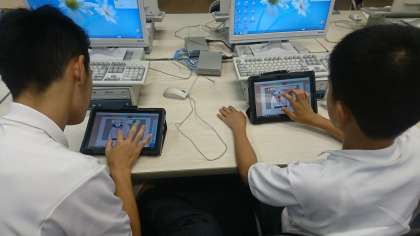 墨江丘中学校の生徒のみなさんが、パワーポイントによる説明をしてくれた後、多目的室では実技の練習、パソコン室では救命テストを行いました。