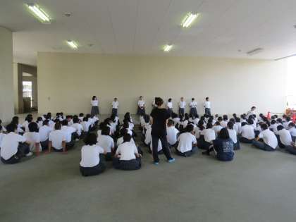 ○ 2年生の夏期事前指導では、各学級代表から、学級の頑張れたこと。みんなが協力してくれたお礼など、みんなで作る学級・学年の思いが語られ、拍手でみんなが答える集会になりました。一人ひとりが まわりのことを考えながら行動できることはとてもすばらしいと思います。2学期はさらなる成長を期待しいます。
