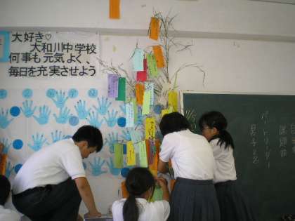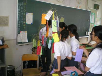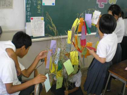 7月5日(金)6限目、1年生が七夕の取り組みとして、短冊に自分の願い事を書き、笹につるしました。