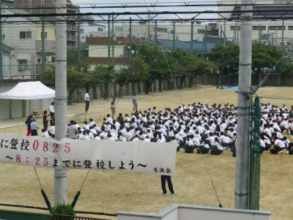 8月29日(金)4限目 和歌山沖震度6の地震を想定し、津波も含めて、真剣な訓練を行いました。2階にいる3年生は3階へ一旦避難し、津波がおさまったと想定し、全校生徒が運動場に避難する。また、町会ごとに人員を確認し、整列をし集団で下校する。