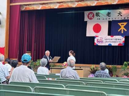 敬老会には、地域の方がたくさん集まっておられ、長寿や金婚式を迎えられたご夫婦のお祝いを行いました。
