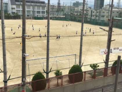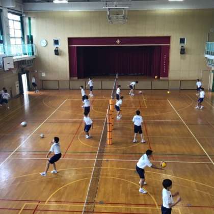 3年2組と3組の合同体育では、男子は体育館でバレーボール、女子はグラウンドでサッカーに取り組んでいます。