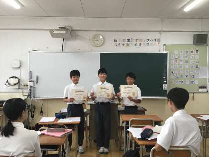 今日の授業で、17日に行ったオリジナルラーメンの発表会の表彰を行いました。
